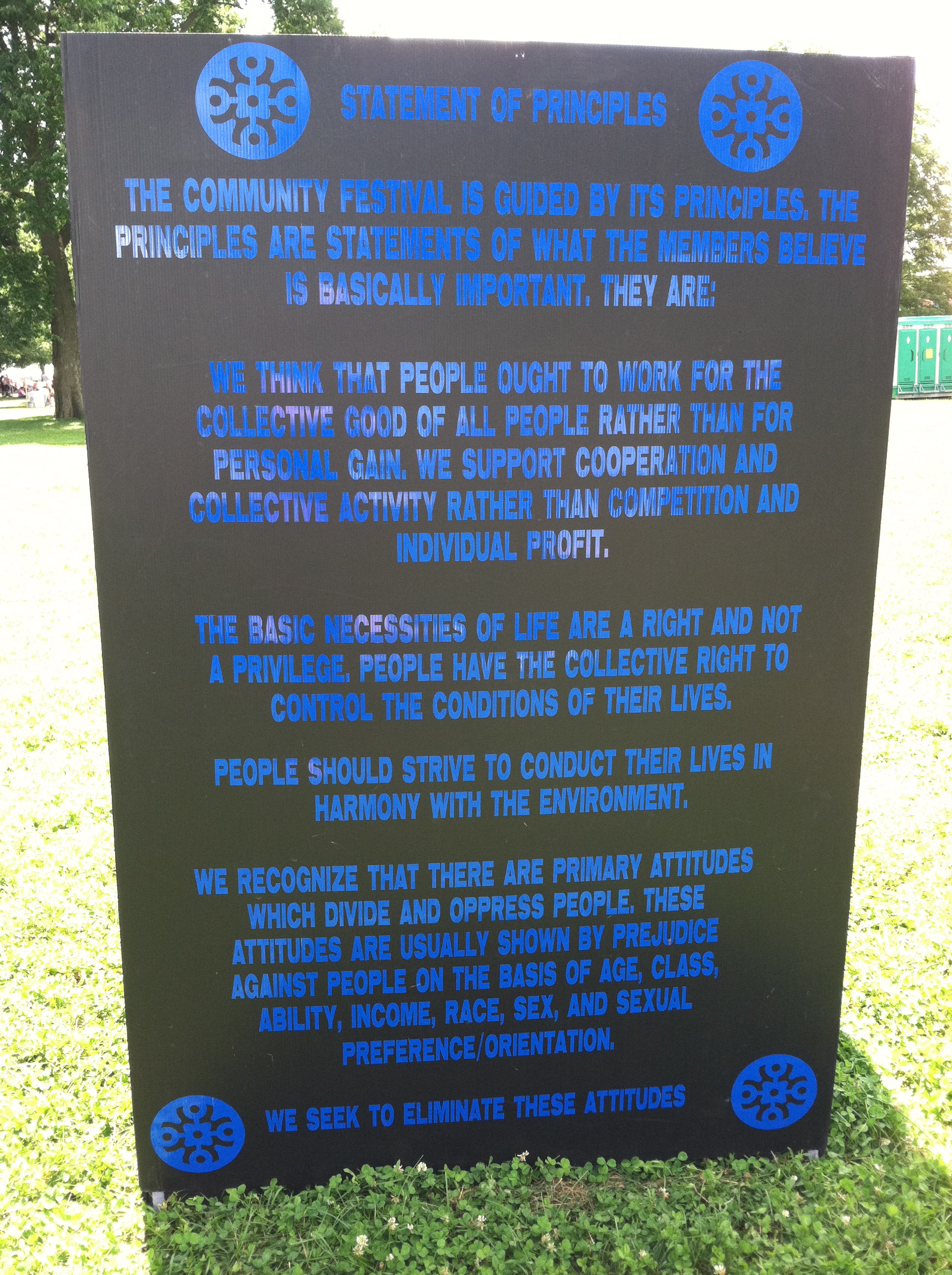 The festival bills itself as “The Party with a Purpose”. To accomplish this goal, the festival relies on community members to work together in the planning and operation of the festival serving on committees and work teams including clean-up and recycling, safety and first aid, entertainment, street fair, and the “World Peace Rocks Forever Committee”.