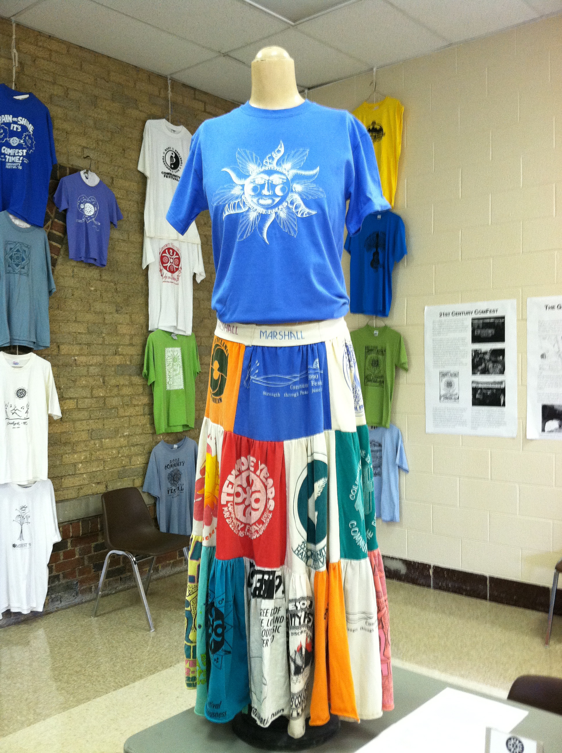 The festival was first held in 1972 in the University District just off-campus as a showcase of community organizations including the Columbus Free Press, Free Health Clinic, Food Co-op, Tenants Union, Crisis Hotline, and Recycling Center. The festival continues to provide a forum for alternative lifestyles, collective activity, and the history of Comfest. Here is a display of Comfest t-shirts in the Shelter House. These t-shirt are only ever earned by volunteering at Comfest and have never ever been for sale.