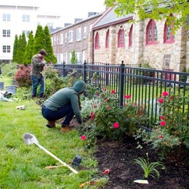 Volunteers plant flowers at Indianola Park next to St. Sophia.