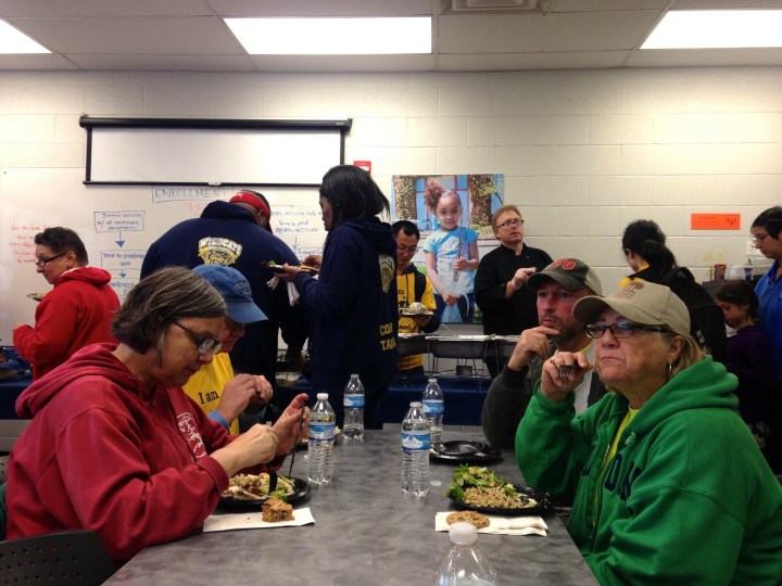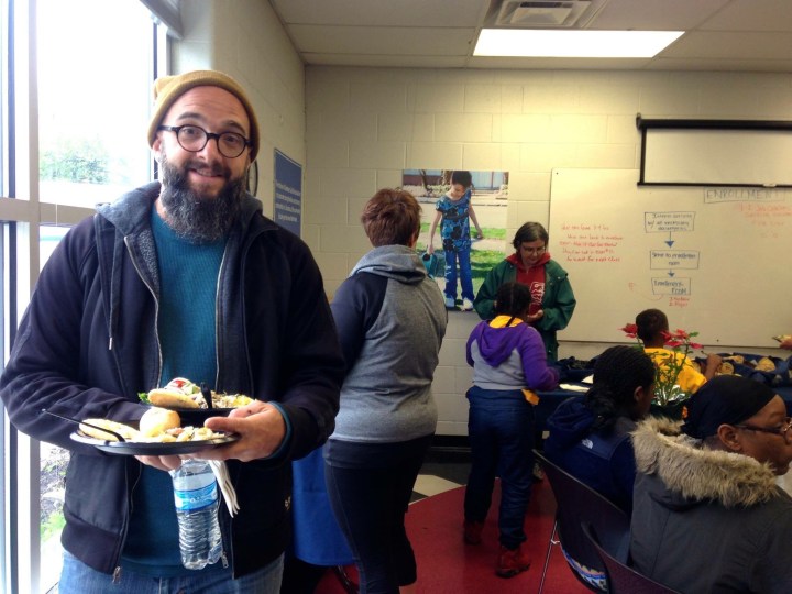Volunteers gather for lunch from Blue Bow Tie Bistro at Godman Guild: